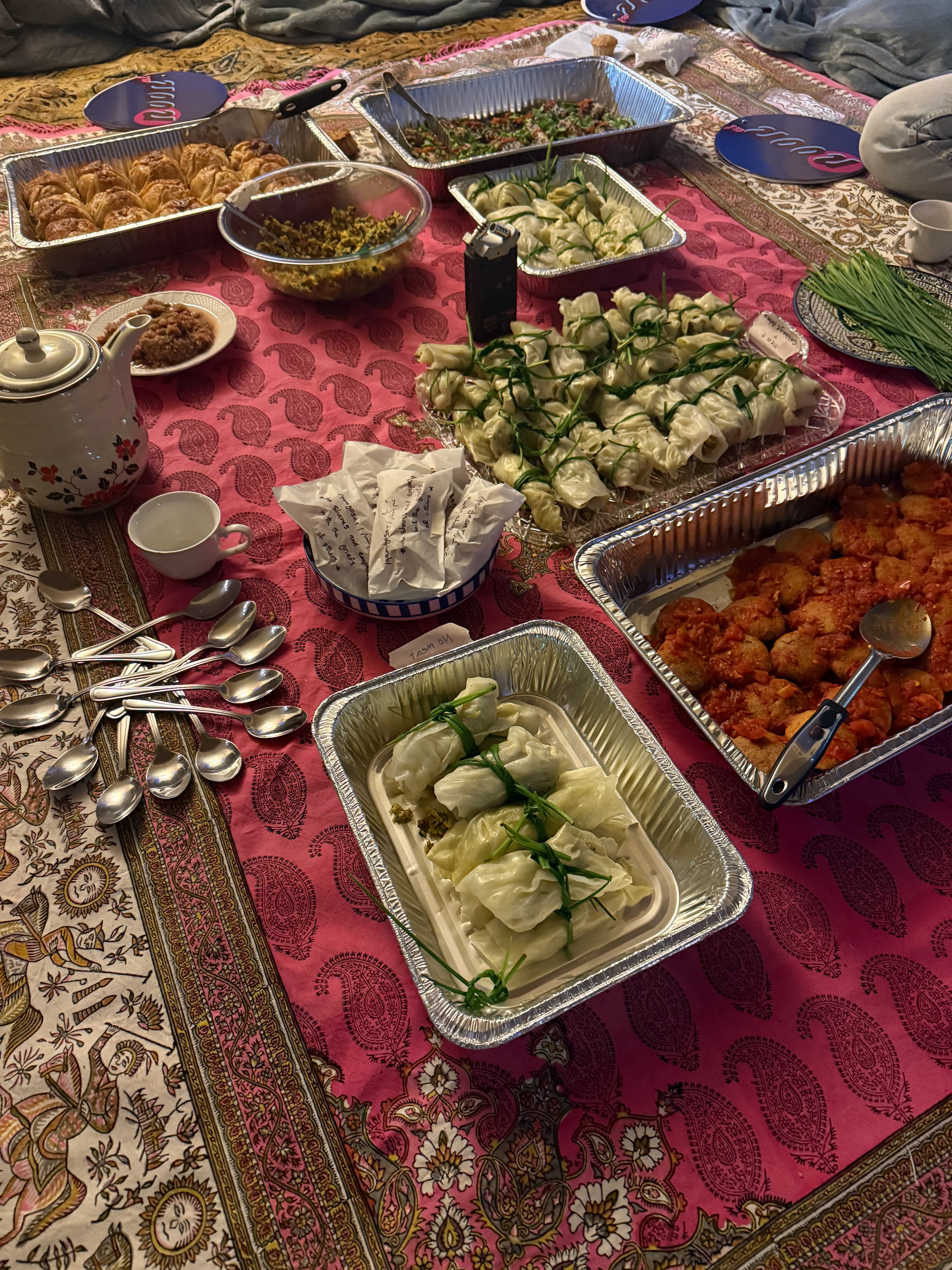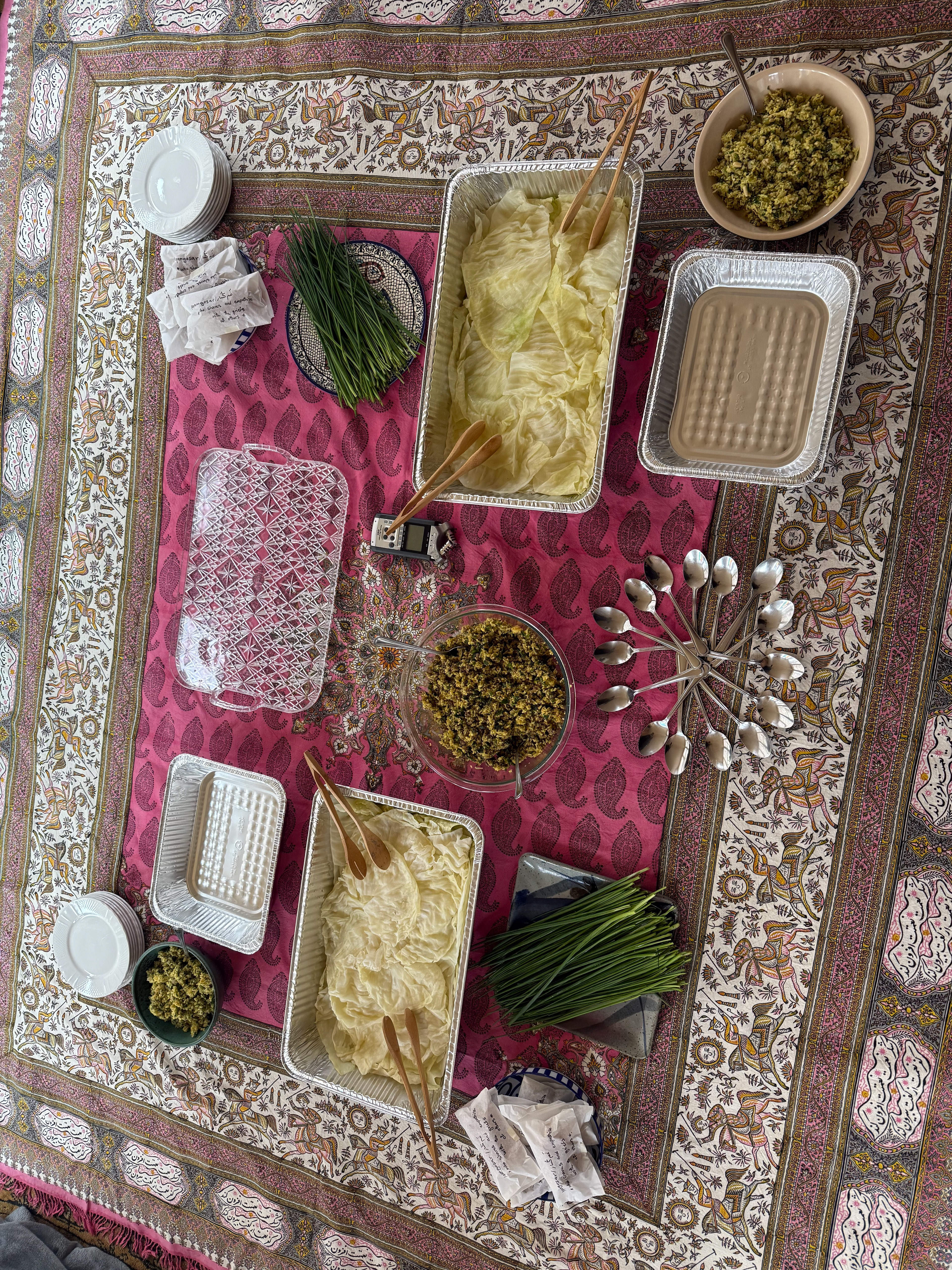 Structured as a three-hour performative workshop, the iteration brought together on-site participants and virtual contributors from around the world. In silence, in-person participants assembled pockets of food such as dumplings, pierogies, and empanadas. At the same time, virtual guests offered two-minute “frequencies of grief” through humming, singing, whistling, poetry, breath, and sighing utterances. These layered sounds formed a shared sonic field of mourning, care, and resonance.